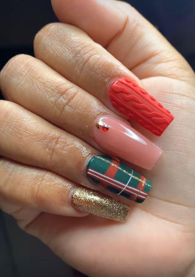 A fun, textured sweater-patterned red nail, gold glitter, plaid green-and-red, and a nude accent with a tiny gem all come together for a playful winter-themed mix.