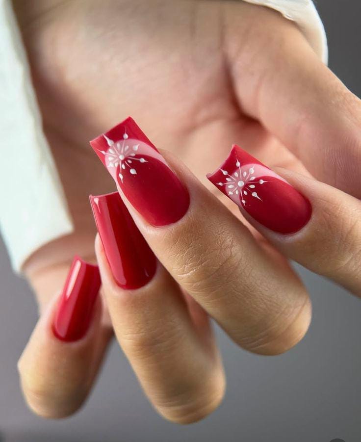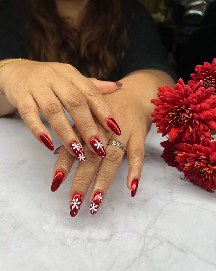 Rich crimson nails decorated with soft white snowflakes bring a classic winter look that feels crisp, seasonal, and playful.