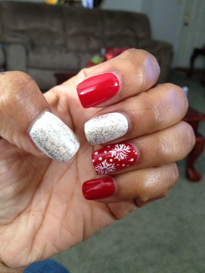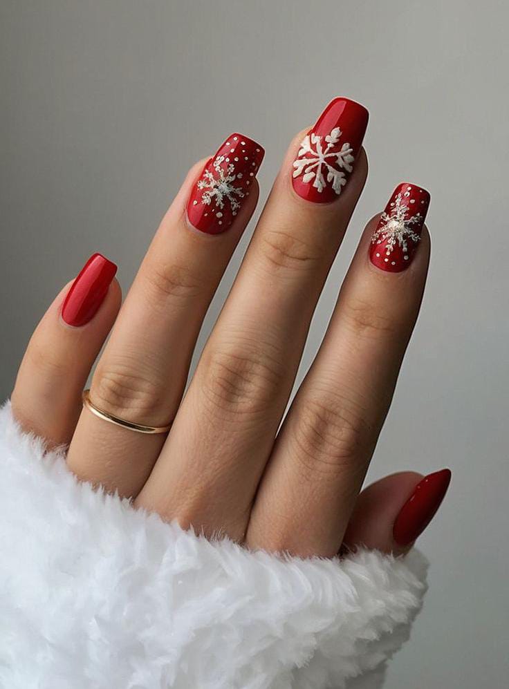 Bright red nails are paired with snowy white speckled accents and a detailed red snowflake nail, creating a traditional, charming holiday-ready winter design.