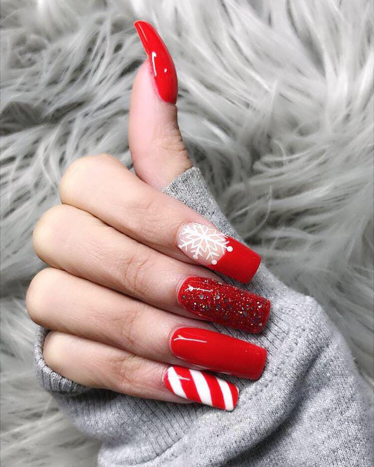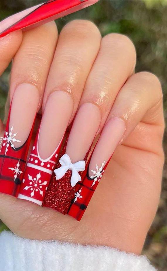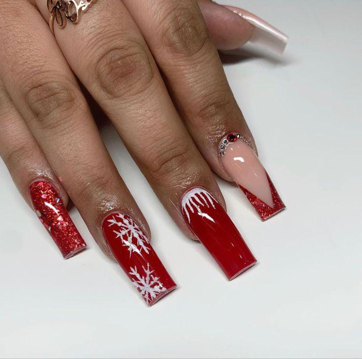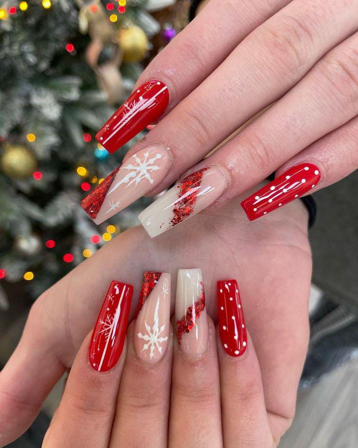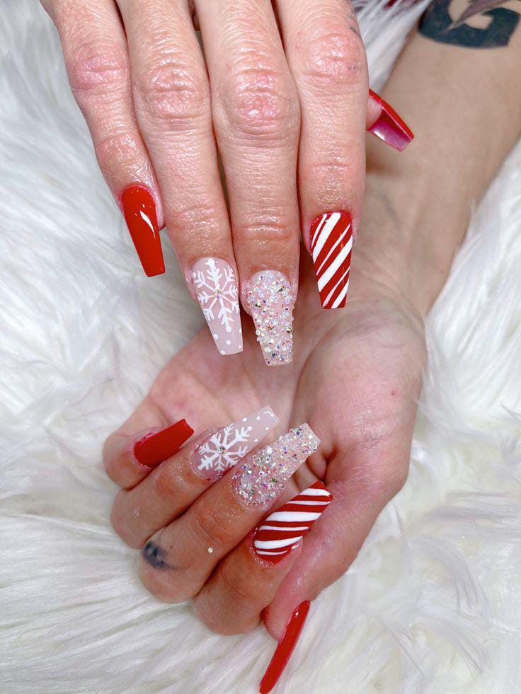 Long red and nude nails are decorated with glittery accents, snowflakes, and candy-cane-styled diagonals, creating a lively and cheerful winter look. The mix of sparkle and seasonal motifs makes it bright and eye-catching.