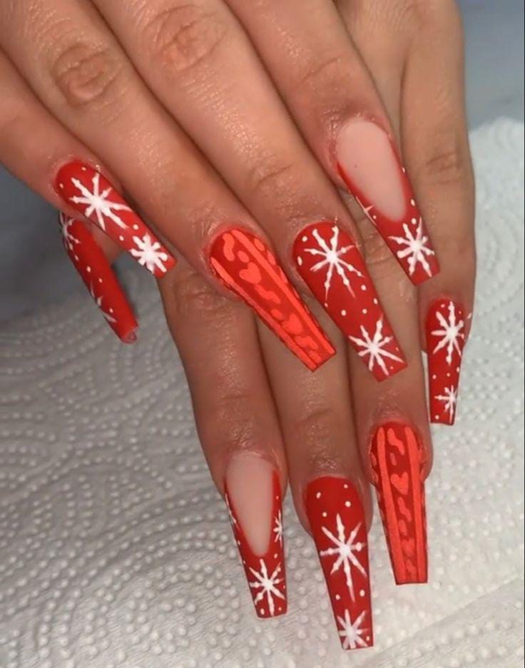 These long matte red nails stand out with bold white snowflakes and subtle textured patterns, offering a striking, modern winter vibe.