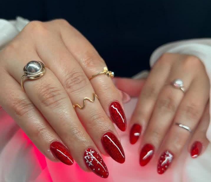 This design features bright, glossy red nails paired with a single glittery red accent and a delicate snowflake pattern, giving it a cheerful yet wintery vibe. It’s simple, festive, and perfect for a classic holiday look.