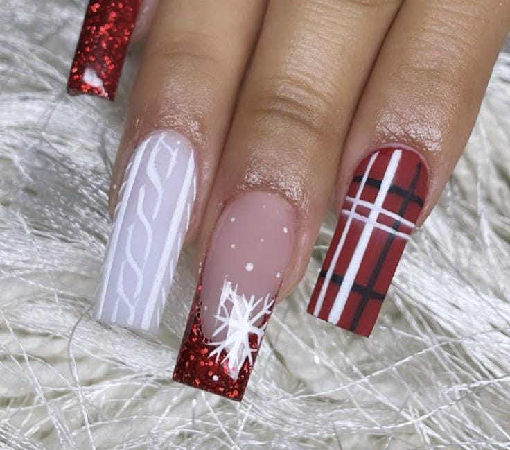 This design combines red glitter tips, soft nude bases, white cable-knit texture, and bold red plaid for a perfect blend of cozy patterns and holiday sparkle. It’s a stylish mix of winter classics in one set.