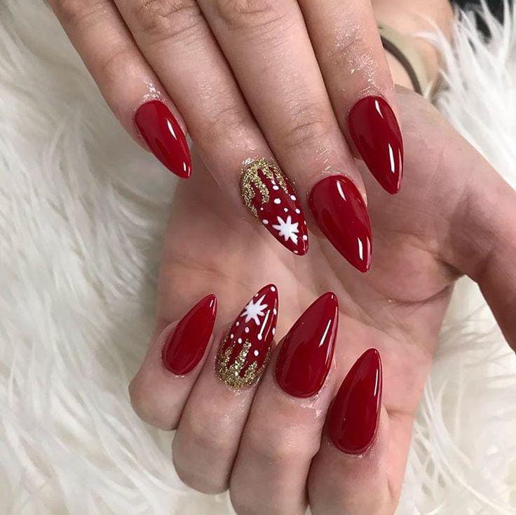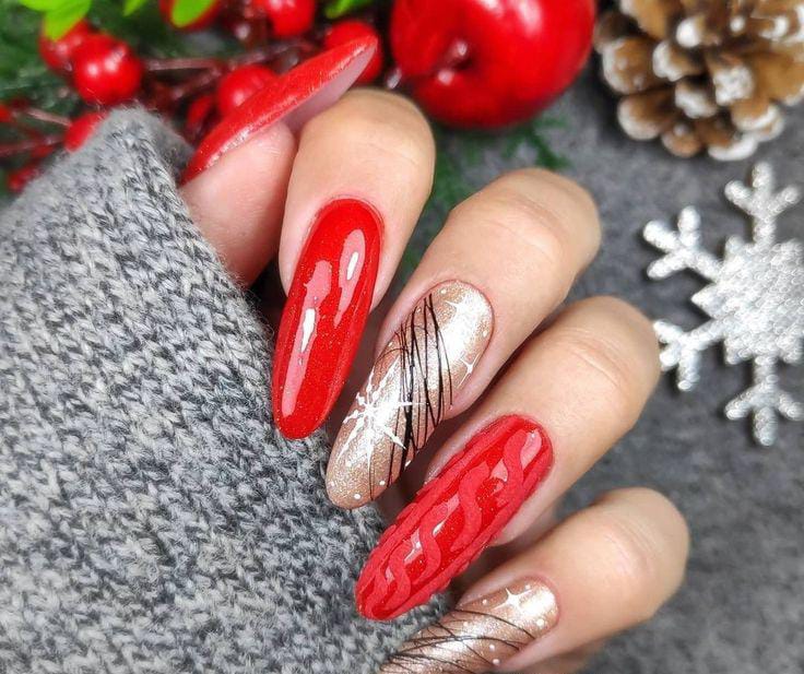This design mixes rich, glossy red nails with shimmering gold accents, creating a luxe winter look that feels both festive and elegant.