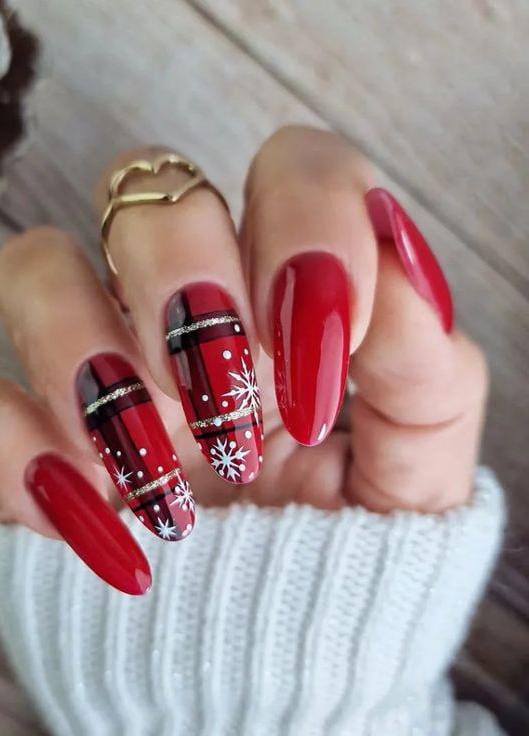 This design mixes bold red nails with crisp white snowflakes and plaid pattern stripes, creating a classic and festive winter look.