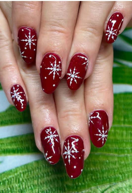 These nails showcase a deep, glittery red base topped with bright white snowflakes, creating a bold, shimmering winter look. The contrast makes the design feel both festive and eye-catching.