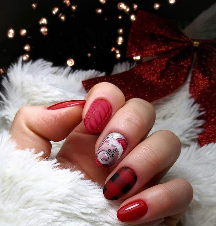 This playful set blends glossy red, sweater-textured matte designs, plaid, and an adorable Santa-style bear, creating a fun and cozy winter holiday look.