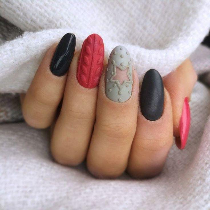 This design blends matte black, deep red, and soft grey tones with knitted sweater textures and a cute star cut-out, giving the nails a warm, cozy winter feel.