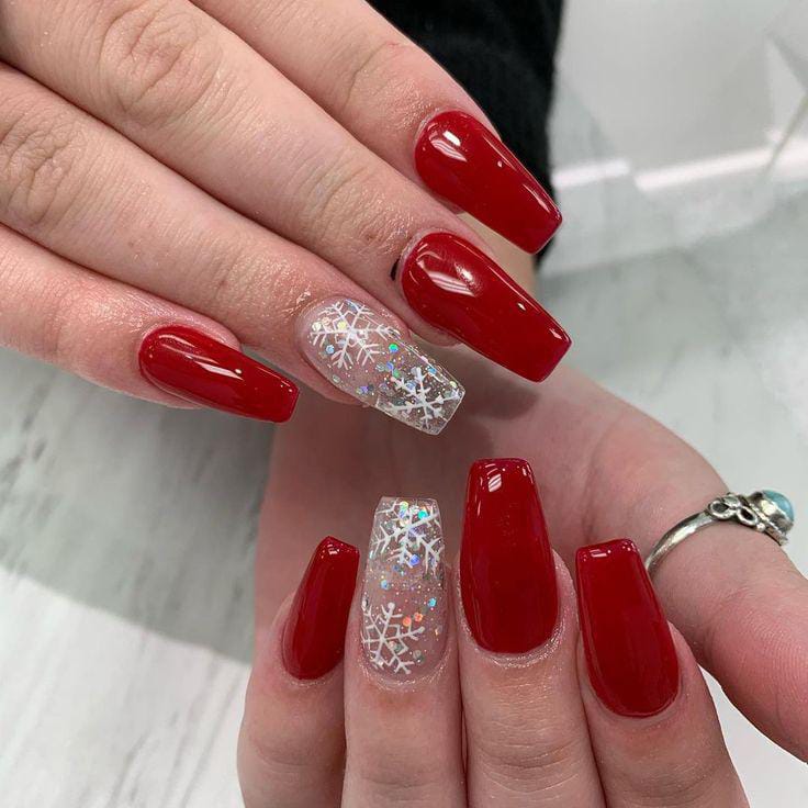 Glossy red coffin nails are elevated by a transparent glitter accent nail decorated with delicate white snowflakes, giving the set a chic, winter sparkle.