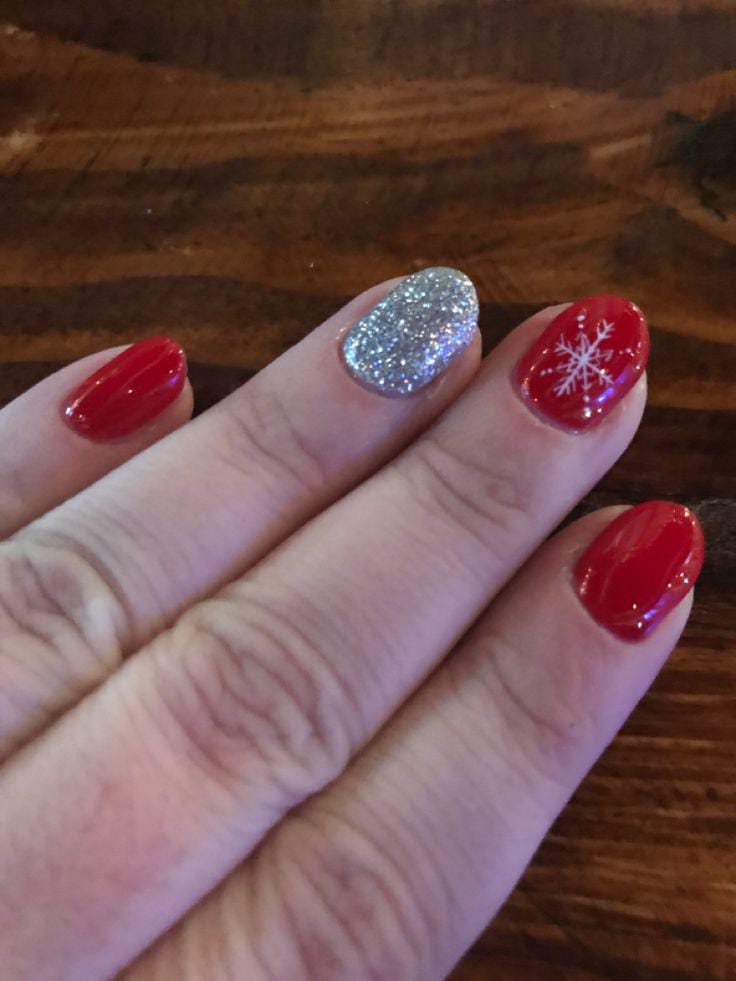 These short red nails get a fun winter twist with a bold white snowflake and a shiny silver accent nail. The combination is bright, sparkly, and full of seasonal charm.