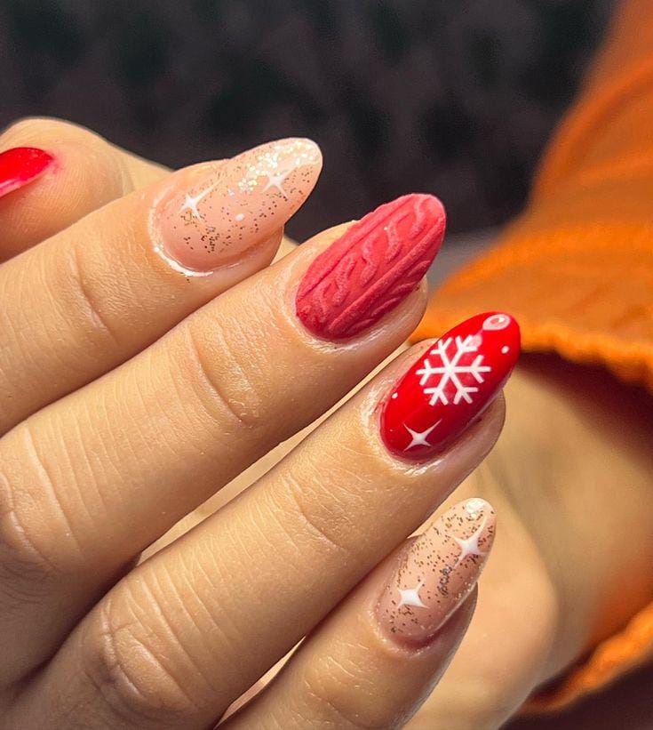 A blend of soft nude glitter nails, bright red snowflake art, and a textured cable-knit sweater nail creates a warm, winter festive design that feels both cozy and playful.