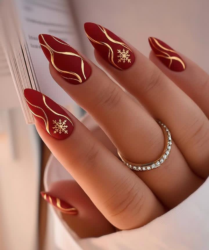 Matte burgundy nails highlighted with flowing gold lines and tiny golden snowflakes give a luxurious, warm, and sophisticated winter aesthetic.