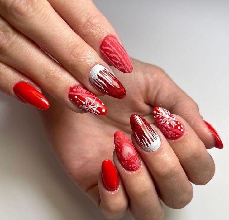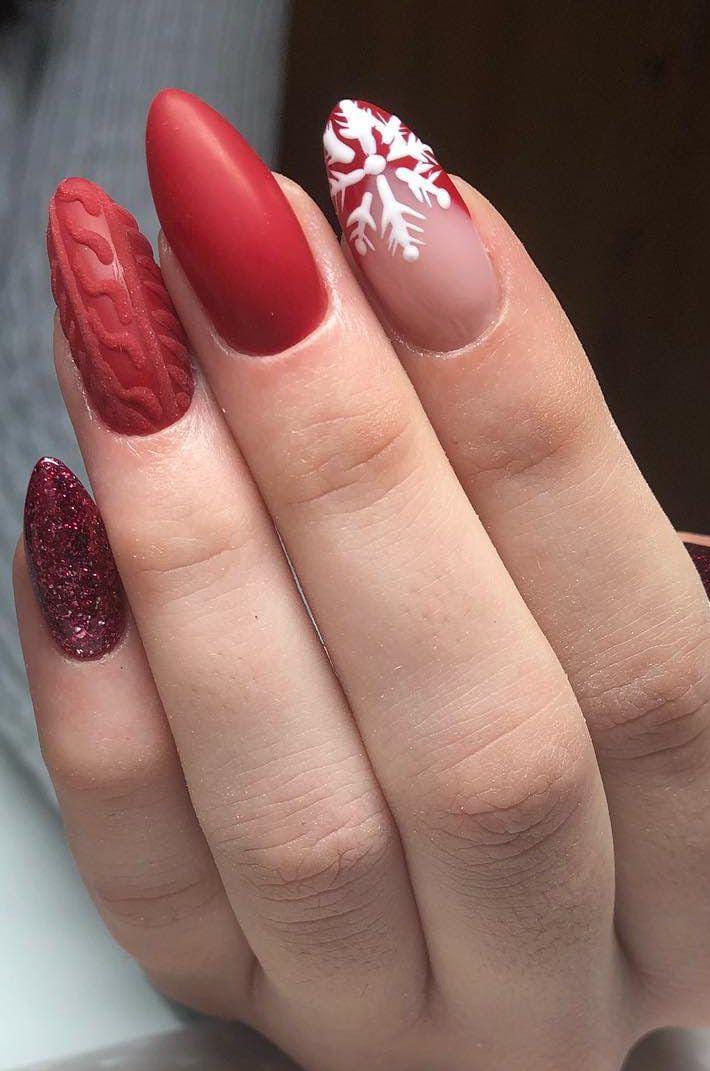 A striking mix of matte red, glittery deep-red sparkle, a cable-knit textured nail, and a frosty snowflake accent combines into a bold and stylish winter manicure.