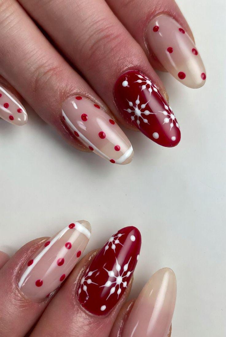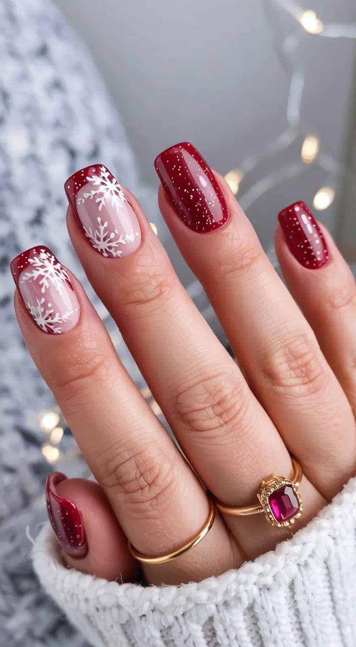 Deep red nails are mixed with soft nude bases topped with white snowflakes and speckled details, creating a dreamy “falling snow” effect. It’s elegant, cozy, and perfect for a polished winter look.