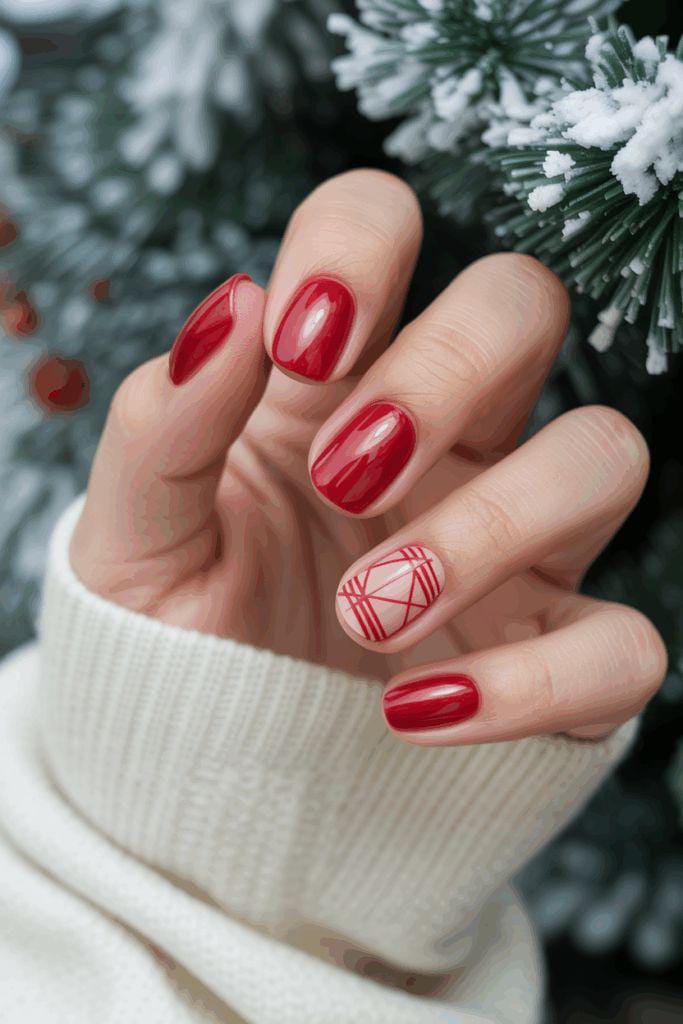 Glossy red nails are paired with a single nude accent decorated with clean, geometric red lines. It’s a simple, modern winter style that still feels warm and festive.