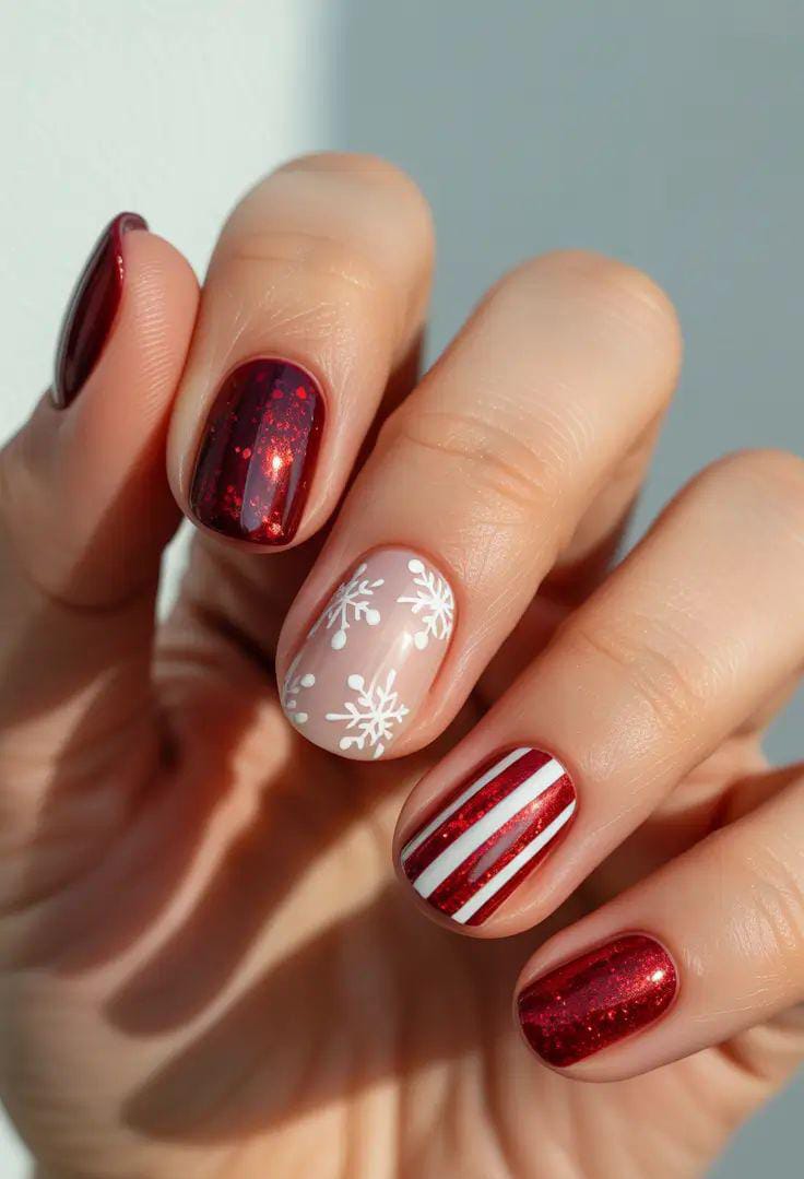 This set blends deep red glitter nails with soft winter details, featuring white snowflakes and candy-cane stripes for a playful, cozy holiday vibe. It’s a cheerful mix of classic red tones and simple winter patterns that instantly feel seasonal.