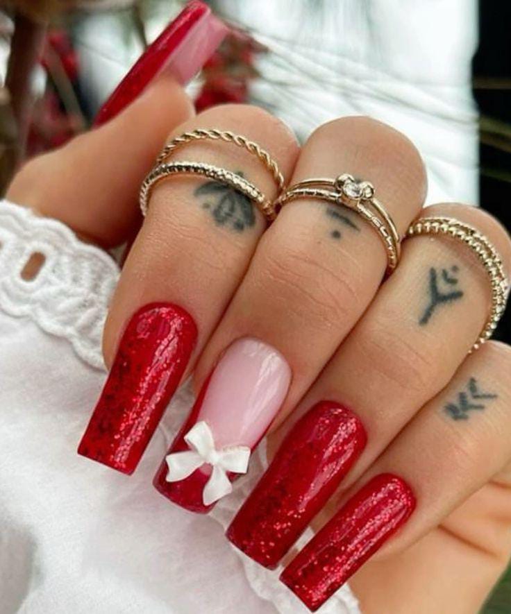 Shimmering red nails pair with a single soft pink accent topped with a tiny white bow, giving the whole set a chic, present-like winter holiday vibe.