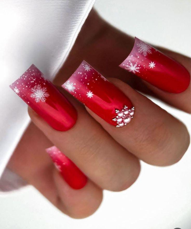 Rich, glossy red nails fade into delicate white snowflakes and small sparkling details, creating a bright winter-night aesthetic.
