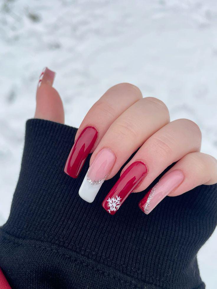 Deep red glossy nails blend with nude and white accents, finished with silver glitter and snowflake art for a classy, polished winter style.