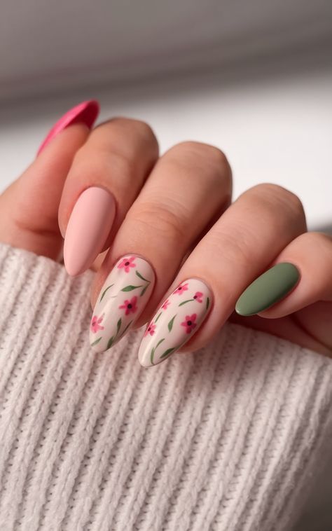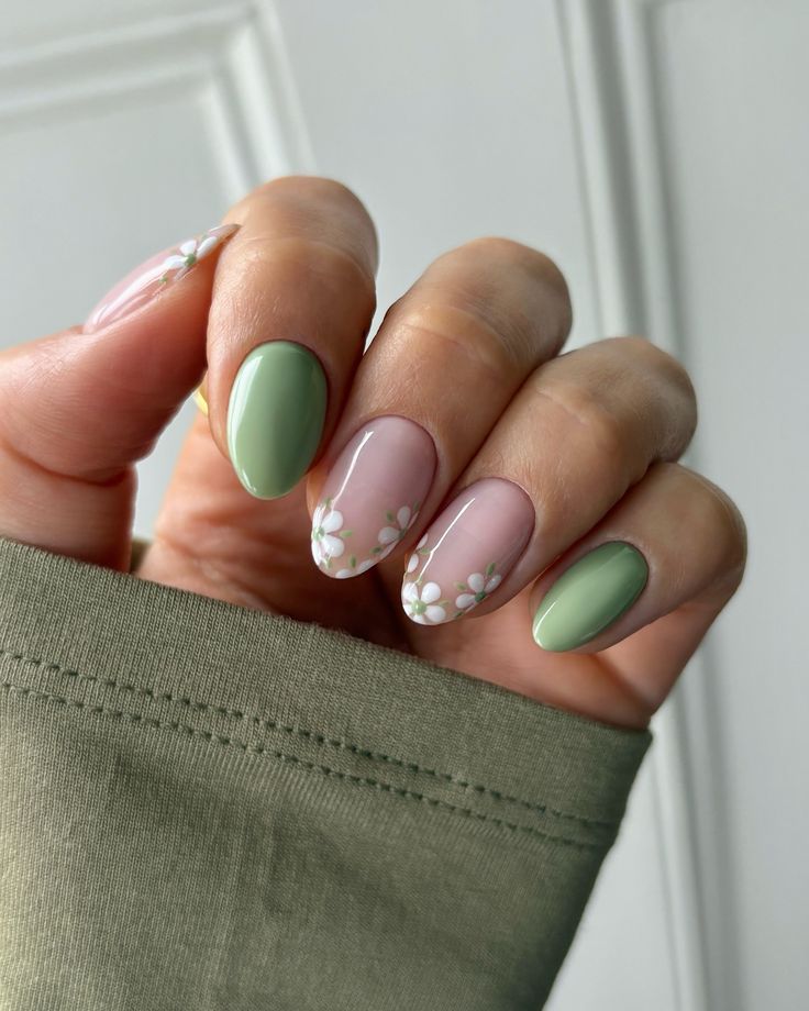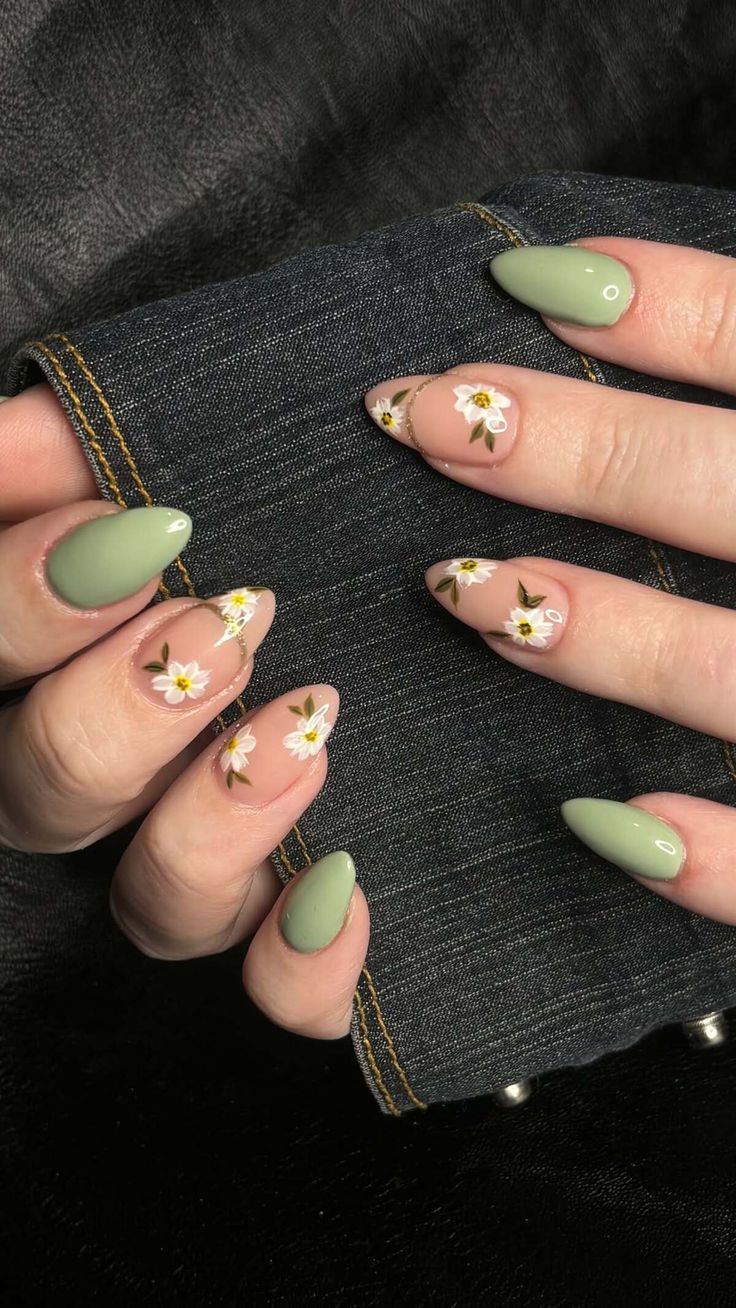 Muted sage green nails are paired with blush accents and tiny white floral details for a sweet, minimal look. The style feels calm, feminine, and effortlessly spring-ready.