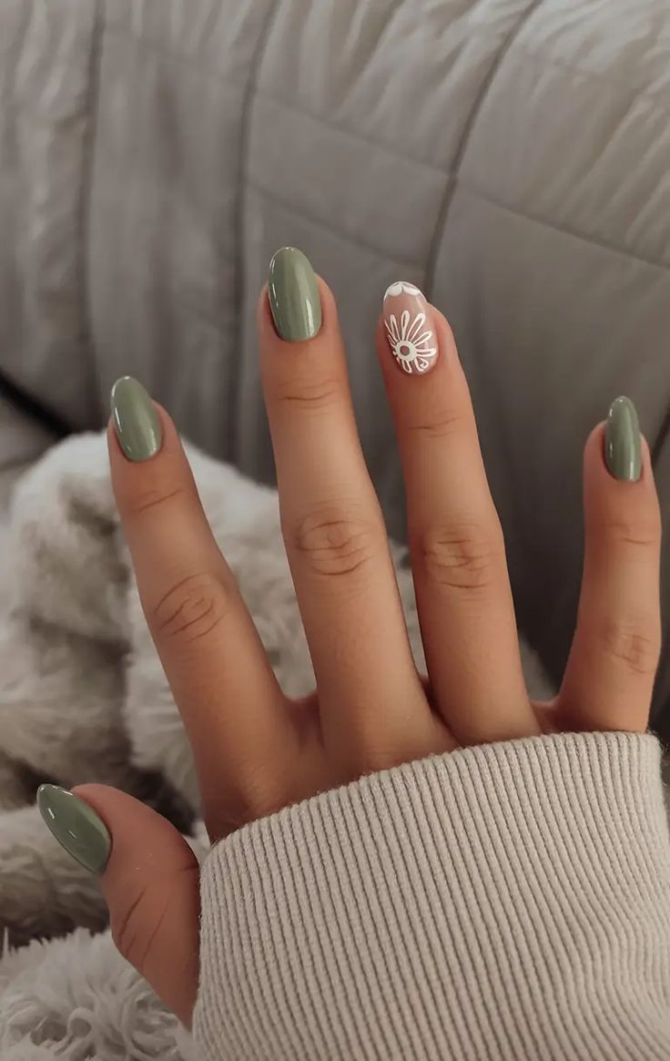 Classic sage green nails are elevated with a single daisy accent on a neutral base. The design feels cozy, simple, and cheerful — perfect for an understated spring aesthetic.