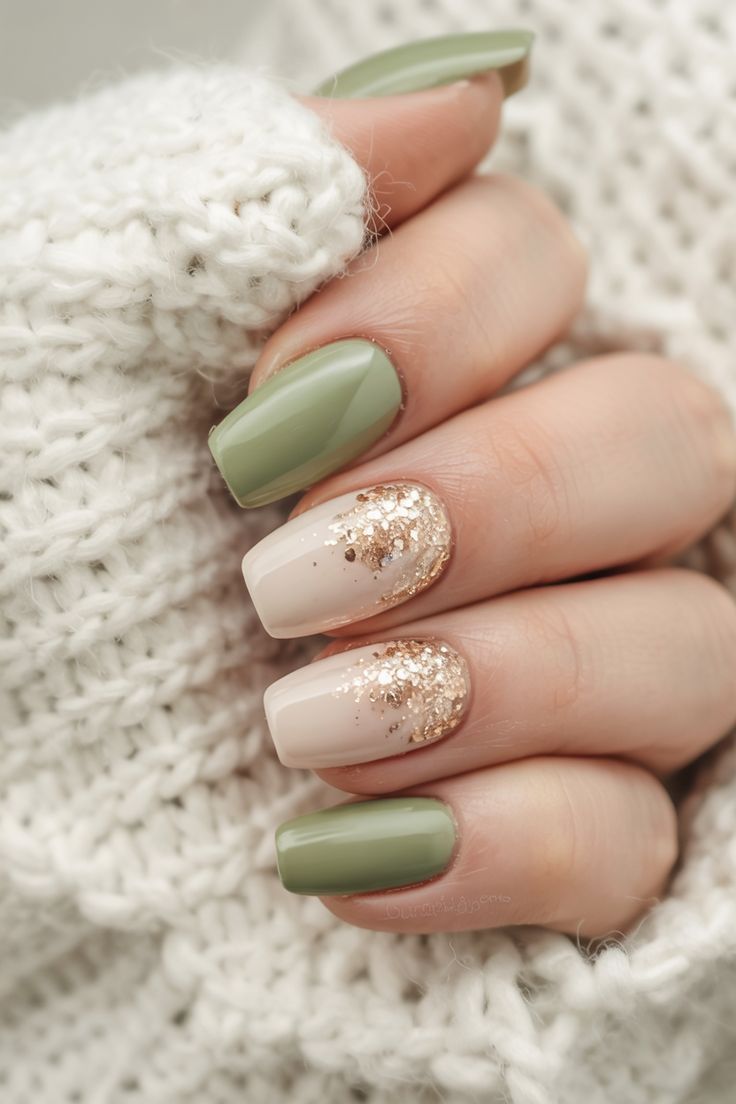 Solid sage green nails are balanced with creamy neutrals and touches of gold glitter. The look feels warm, cozy, and effortlessly chic with a soft spring glow.