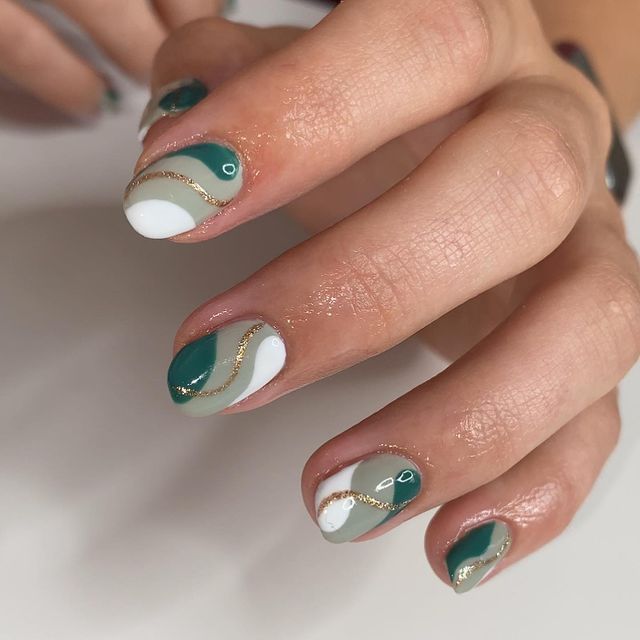 This design mixes sage green, white, and deep green in soft wave patterns with fine gold lines. The vibe is modern, elegant, and slightly artistic with a polished finish.
