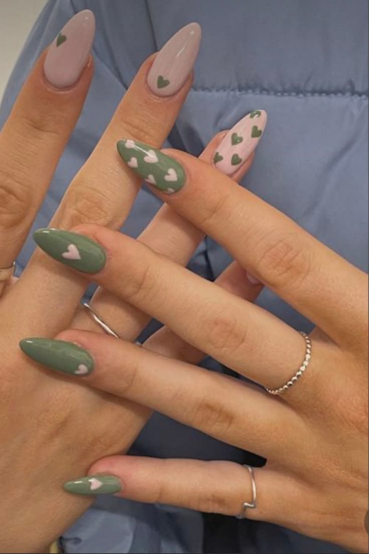 Soft sage green and blush pink create a playful spring palette with tiny heart details scattered across the nails. The look is sweet, youthful, and effortlessly cute without feeling overdone.