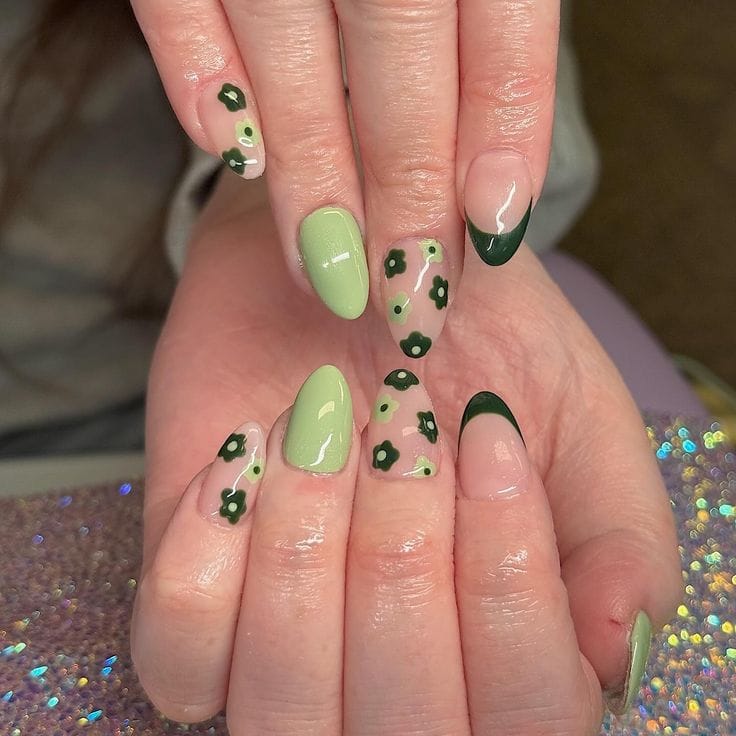 Matte sage green nails are mixed with transparent floral accents for a balanced, nature-inspired look. The design feels calm, organic, and subtly artistic.