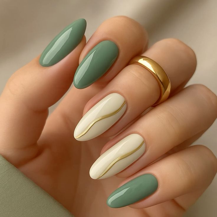 Muted sage and creamy ivory nails are elevated with delicate gold wave accents for a chic, modern finish. The overall vibe is calm, refined, and perfect for an elevated spring aesthetic.