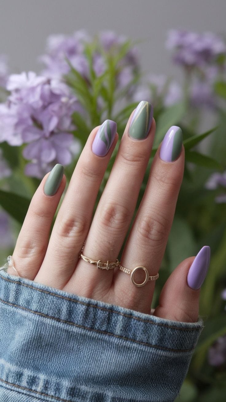 This look combines sage green and soft lavender with tiny white daisy accents for a playful spring feel. The glossy finish and gentle colors keep it light, fresh, and cheerful.