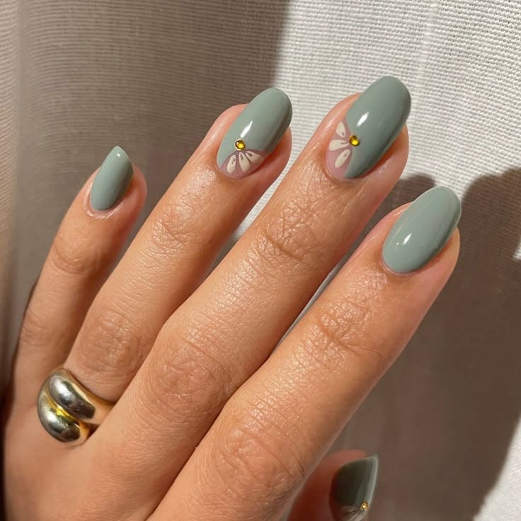 Muted sage green nails are paired with delicate floral accents and tiny gold details for a subtle decorative touch. The overall look feels calm, feminine, and effortlessly polished.