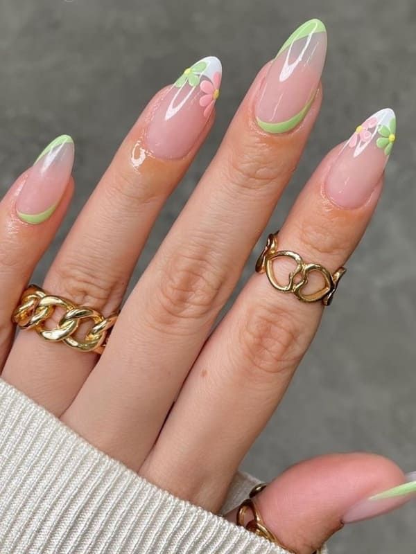 A soft pink base is complemented by sage green and white French tips and tiny hand-painted flowers. The design feels playful yet refined, like a modern spring garden manicure.