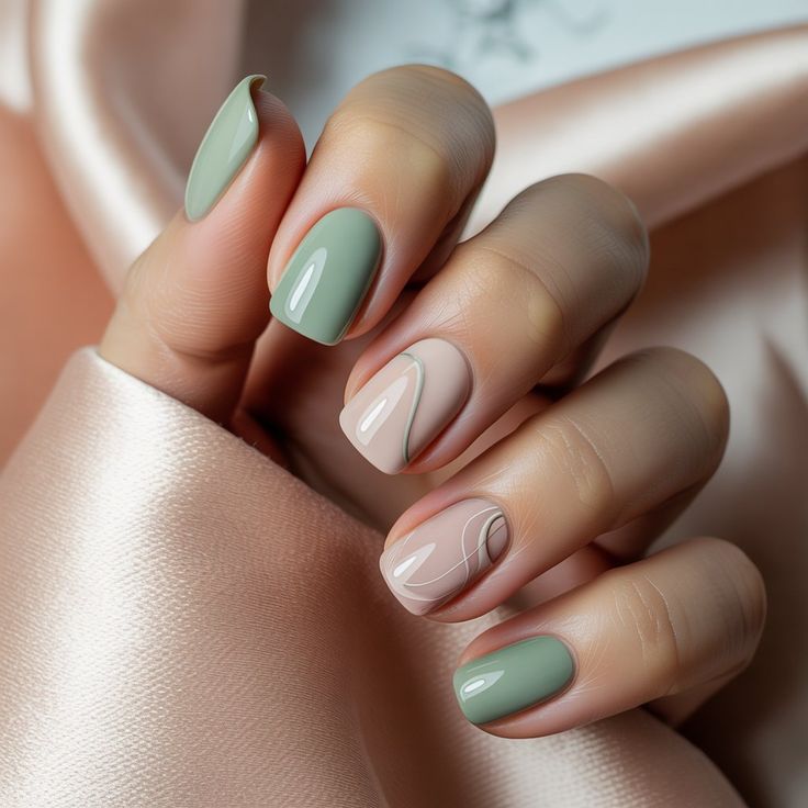 A mix of sage green and nude nails with delicate black botanical details. This design feels artistic, modern, and slightly earthy while still staying light and seasonal.