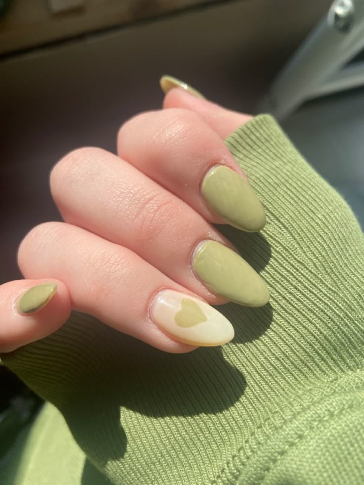 A muted sage green manicure with a creamy accent nail featuring a subtle heart detail. The overall look is minimal, cozy, and effortlessly romantic for spring.