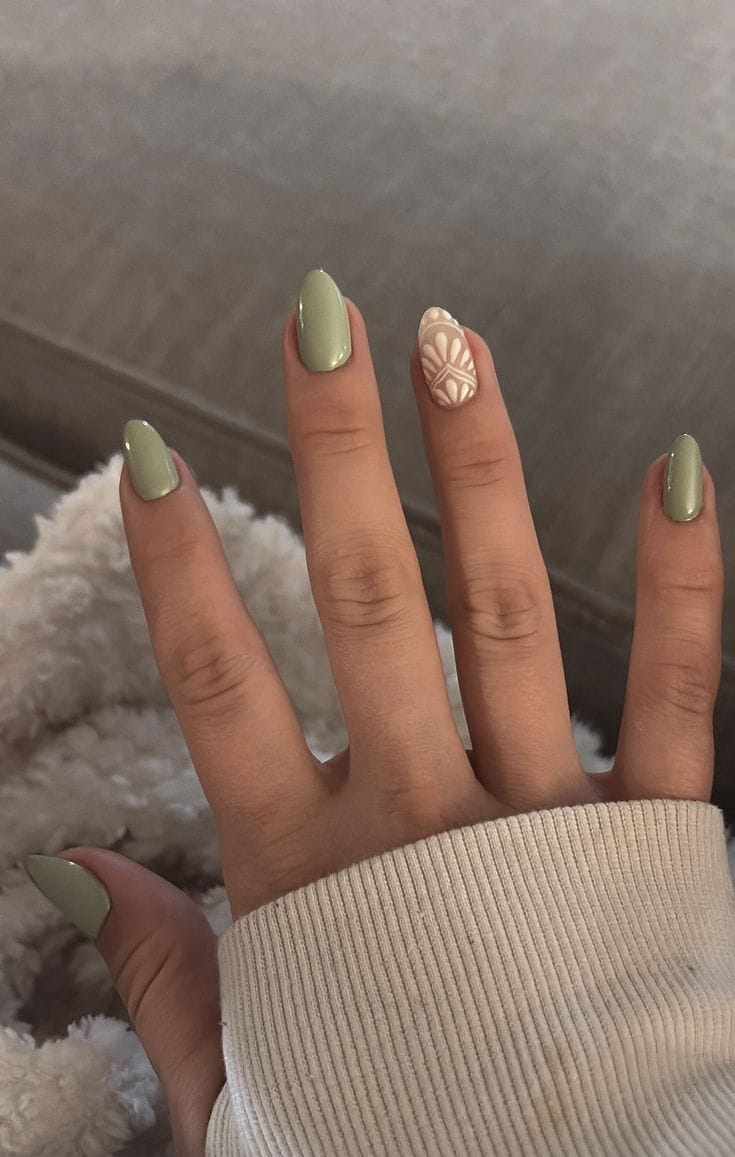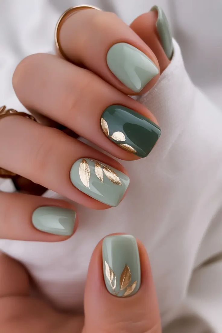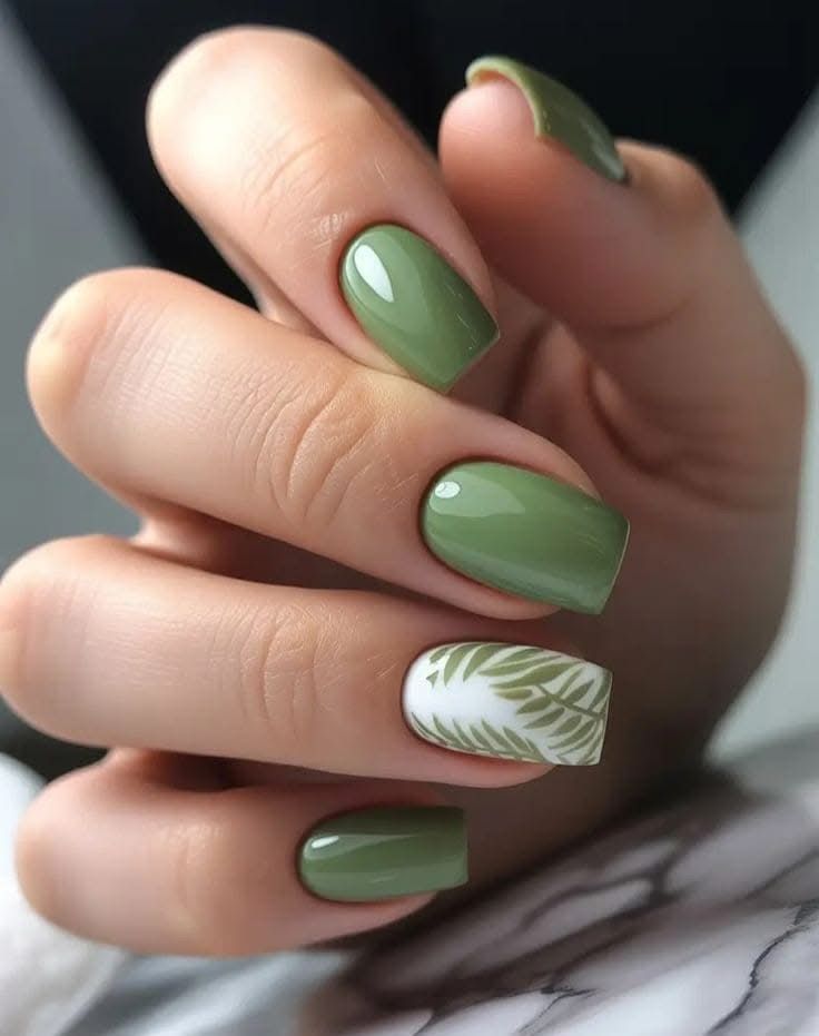 Glossy sage green nails are paired with a neutral accent nail decorated with delicate leaf art. The design feels fresh, natural, and softly elegant.