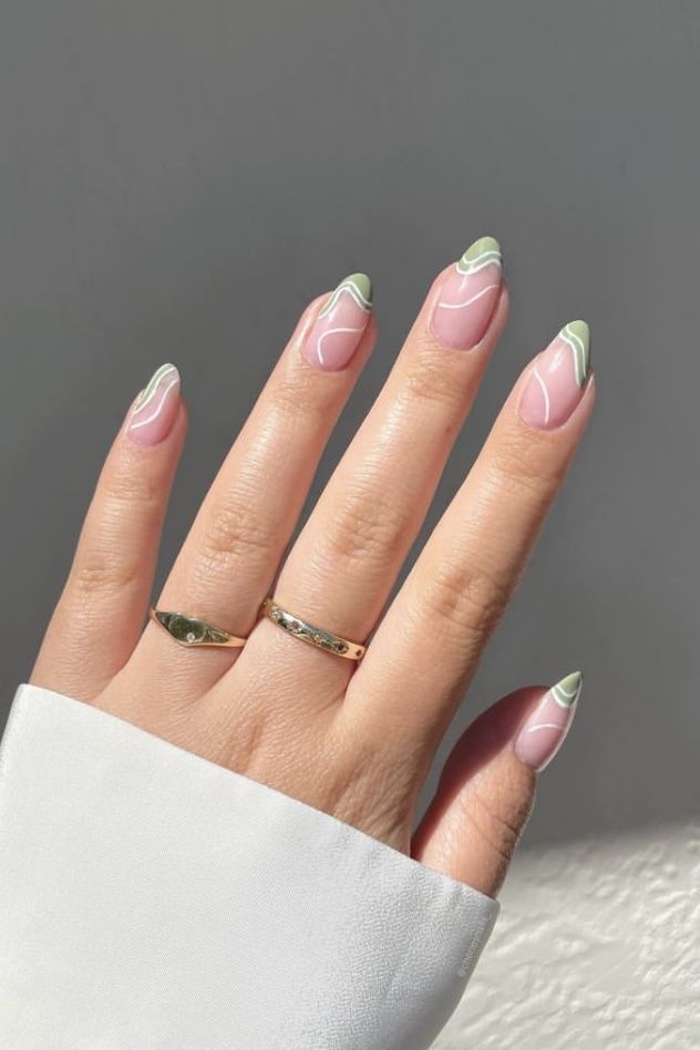 A sheer pink base is topped with sage green French tips and white swirls for a modern twist on a classic style. The vibe is airy, playful, and perfect for a light spring refresh.
