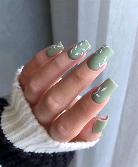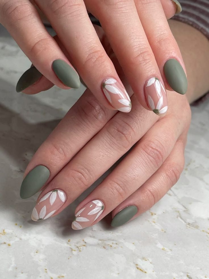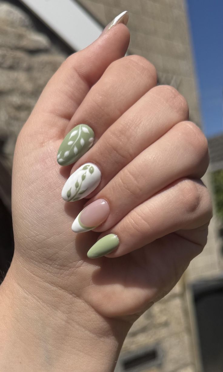 This look combines solid sage green nails with soft nude bases and delicate white leaf designs. The overall aesthetic is natural, serene, and beautifully suited for spring.