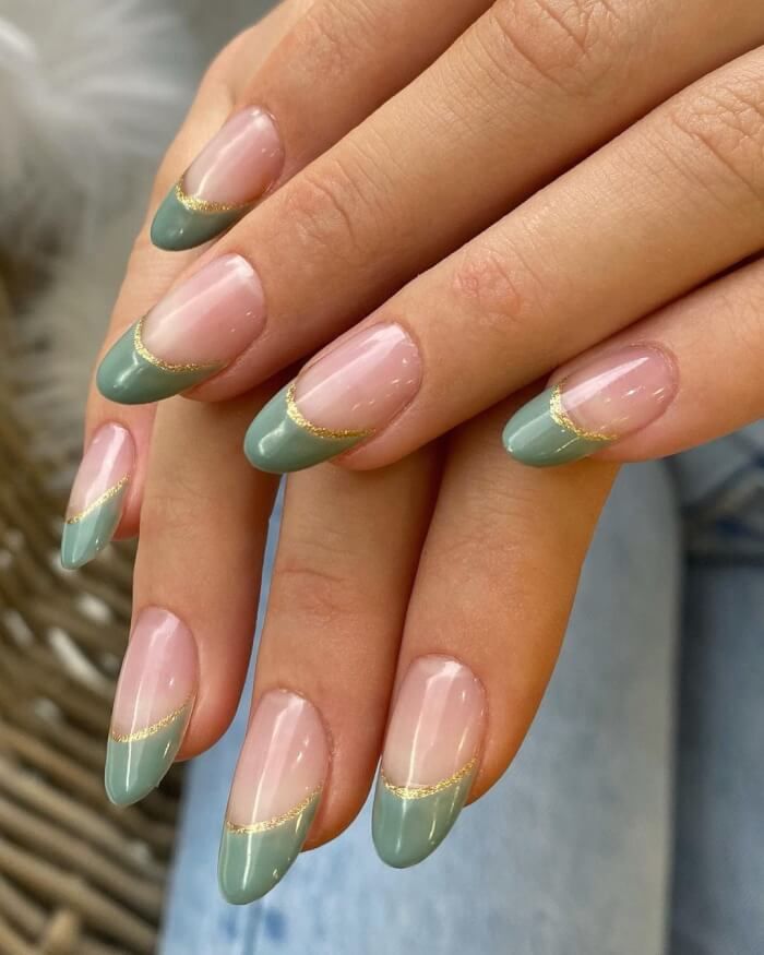 This design features soft sage green French tips paired with a sheer nude base and delicate gold accents. The overall vibe is elegant, fresh, and perfect for a polished spring look.
