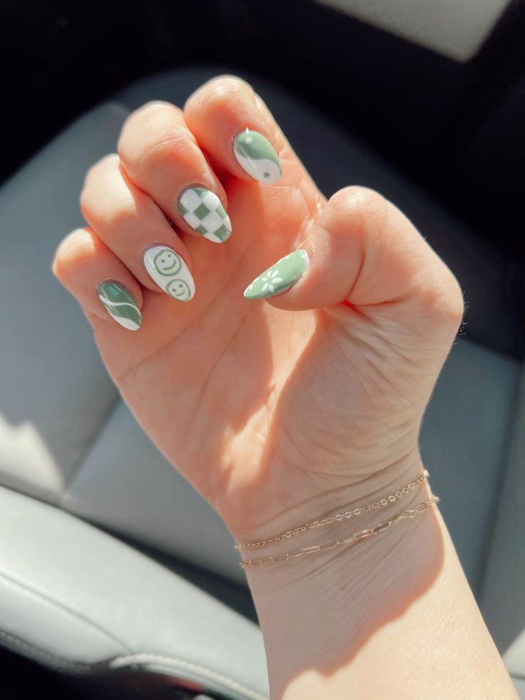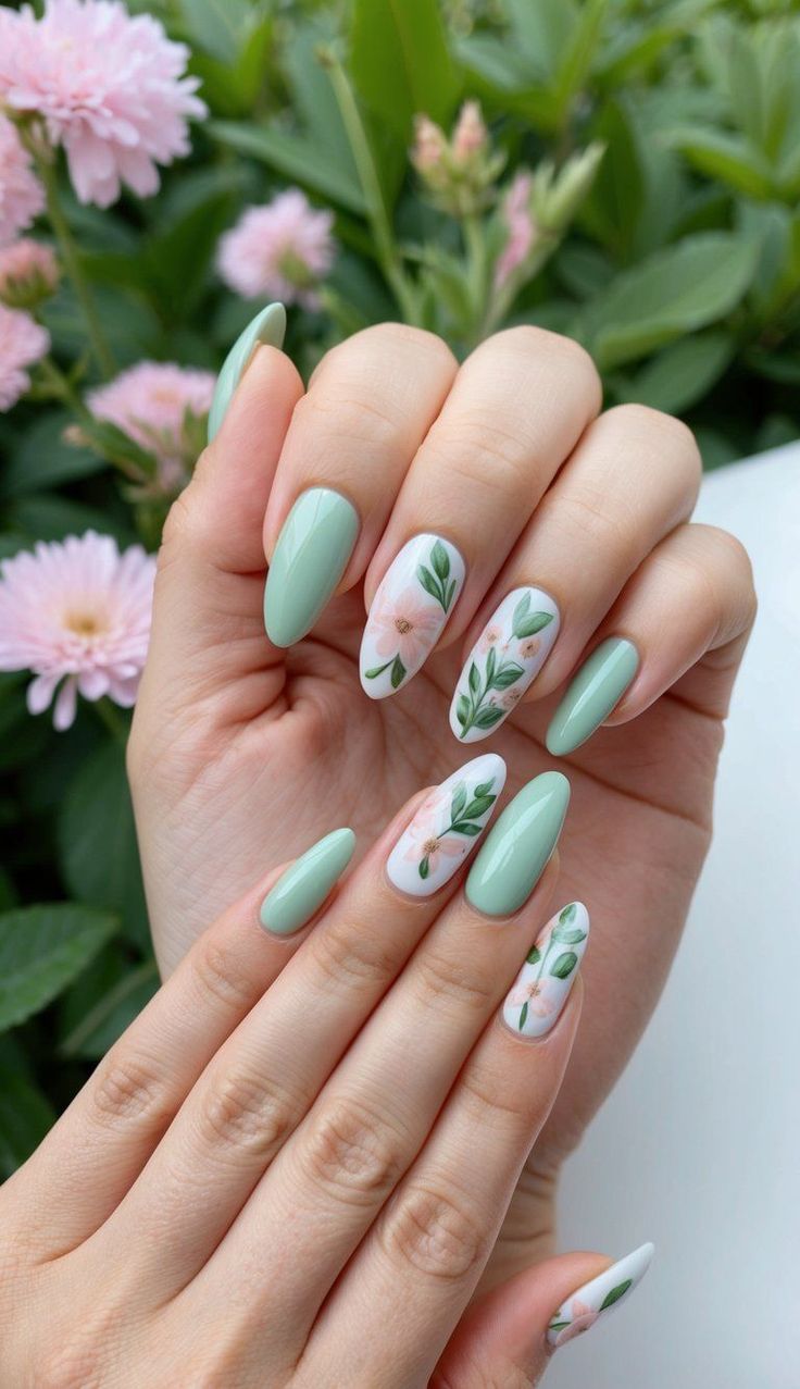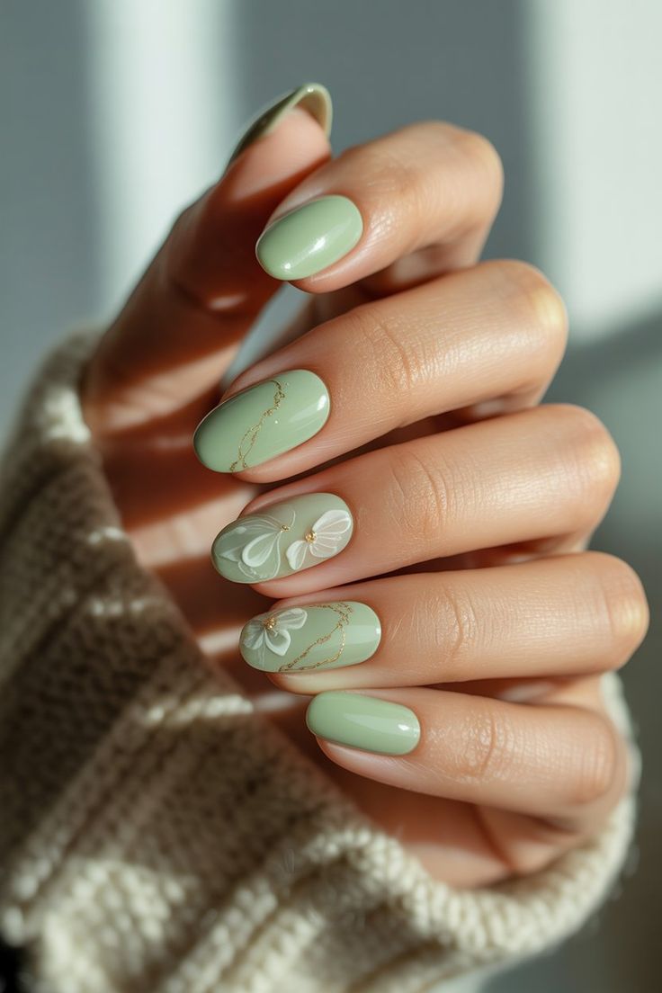 A smooth sage green base is mixed with white accent nails featuring hand-painted floral and leafy designs. It gives off a calm, elegant spring garden vibe with a slightly artistic touch.