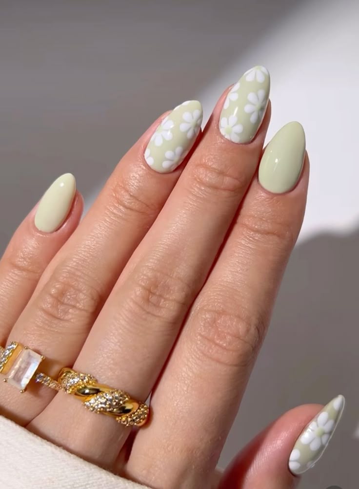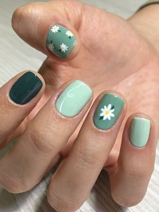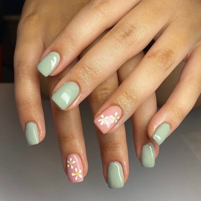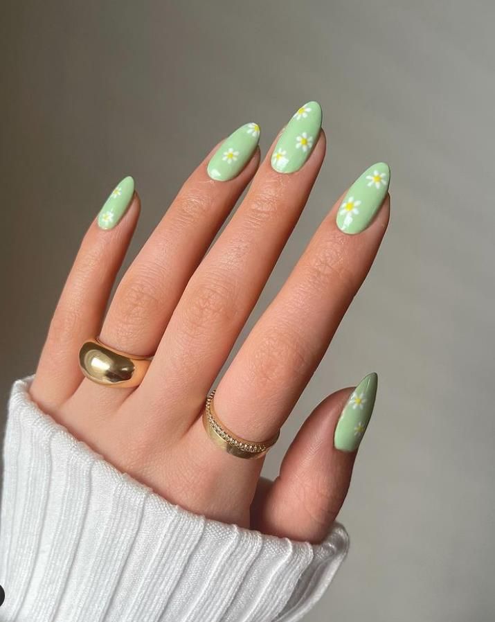 A soft sage green palette is enhanced with tiny white daisy details scattered across the nails. The overall look feels youthful, fresh, and inspired by blooming spring fields.