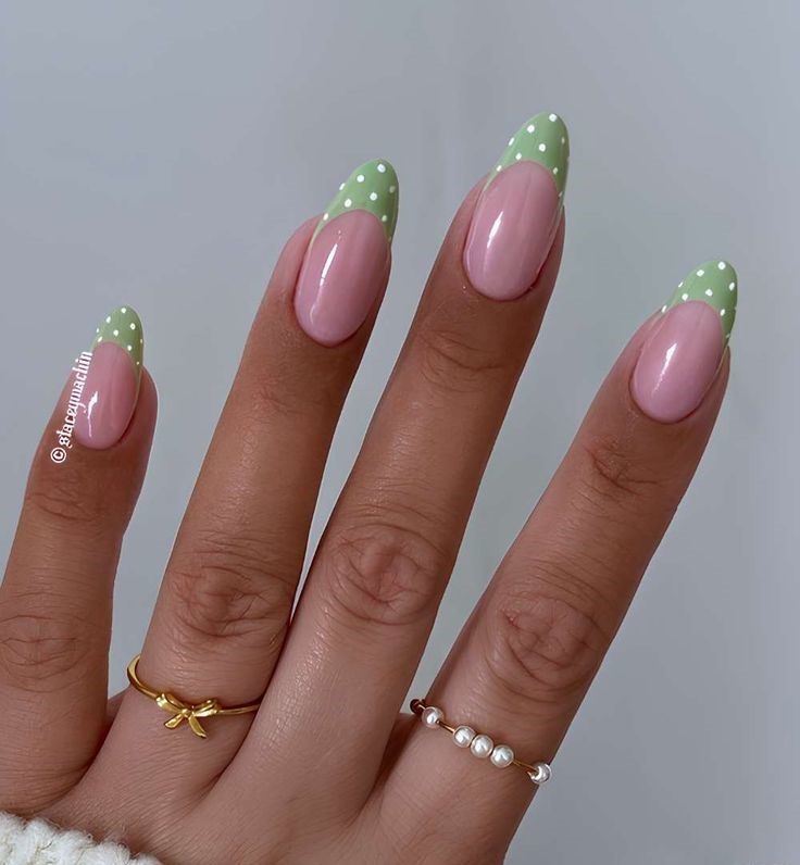 Classic nude nails meet sage green tips decorated with tiny white polka dots. The design feels retro-inspired, clean, and playful without being over the top.