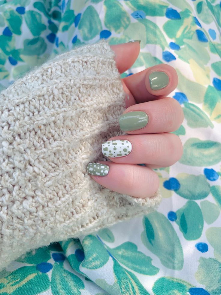 Muted sage green nails are paired with white accents featuring soft green polka dots for a cozy, vintage feel. The look feels relaxed, casual, and effortlessly cute.