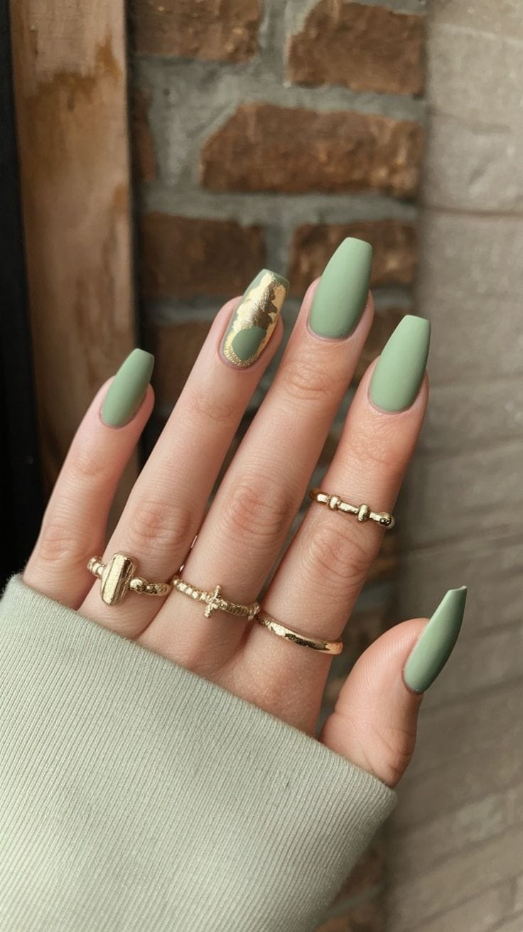 Soft sage green nails with a smooth matte finish are elevated by a subtle gold accent on one nail. The look feels modern, earthy, and effortlessly chic.