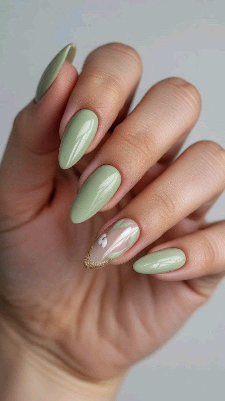 Glossy sage green almond nails paired with a sheer accent featuring a delicate white floral detail. The overall vibe is minimal, elegant, and very fresh for spring.