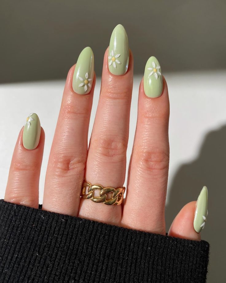 Light sage green nails decorated with tiny white daisy accents for a playful yet polished look. It feels cheerful, youthful, and perfect for everyday spring wear.
