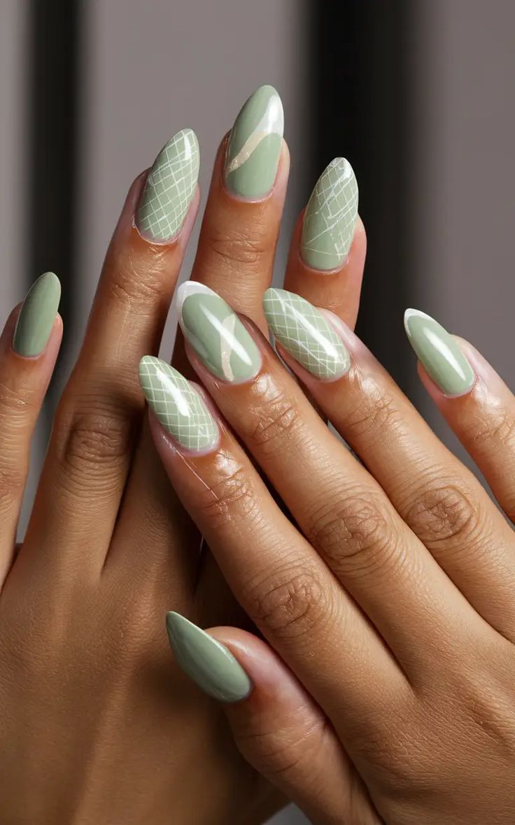 Glossy sage green nails featuring fine white grid patterns and curved accents. The look is clean, contemporary, and effortlessly chic for spring.