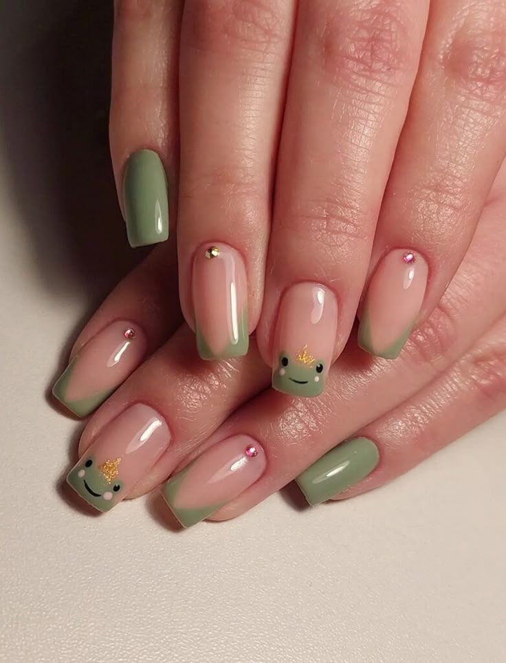 This design features soft sage green French tips paired with a sheer nude base for a fresh spring look. Cute smiley accents and tiny gems add a playful, lighthearted vibe without feeling overwhelming.