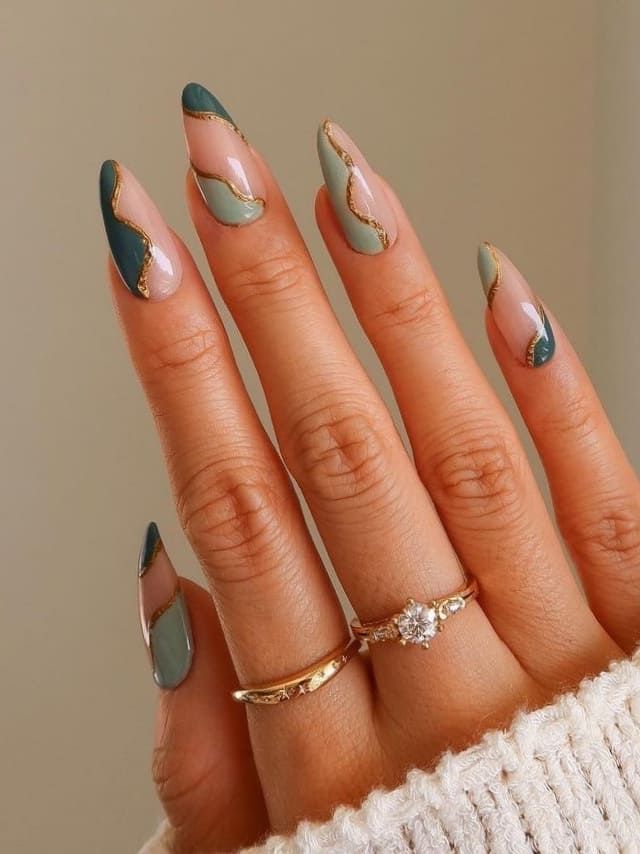 This design mixes sage and deep green tones with a glossy, minimalist finish that feels polished and modern. The gold rings and jewel accents give it an elegant, understated luxury vibe.