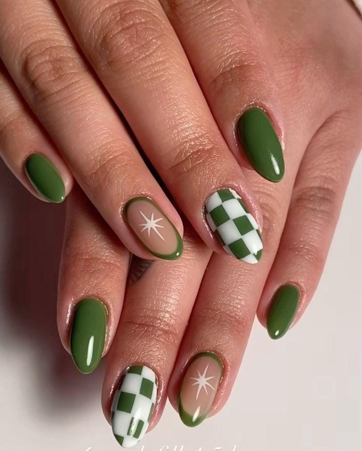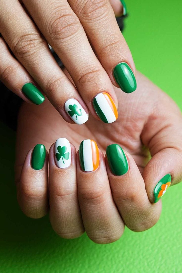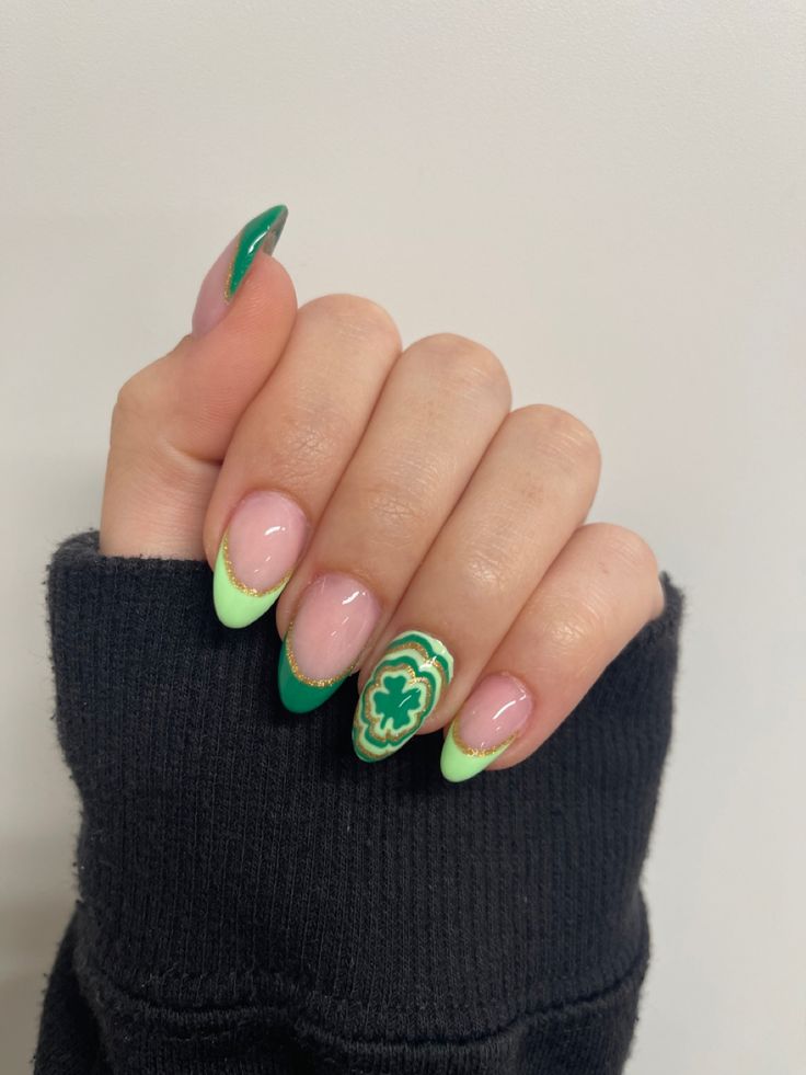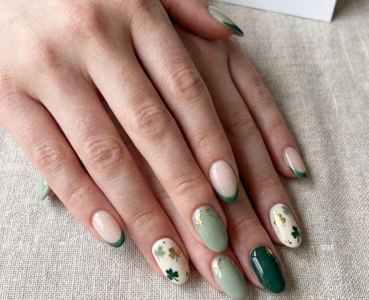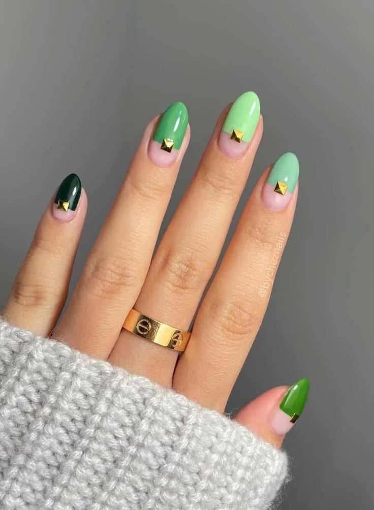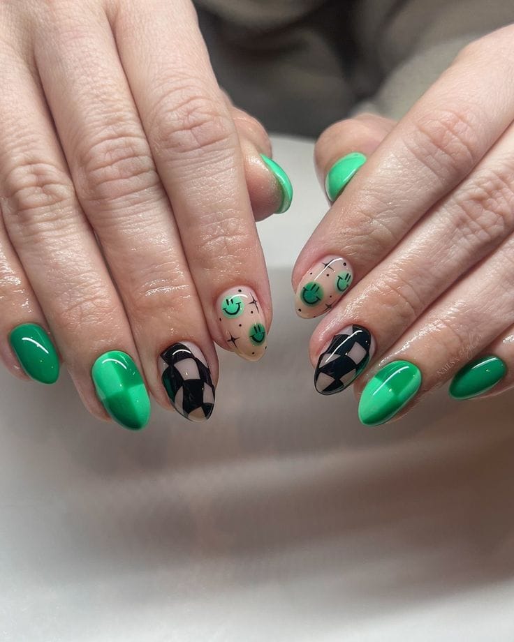 A playful mix of deep green and pastel mint shades creates a bold but balanced contrast. The tiny gold studs add a chic, lucky touch that feels stylish and celebratory without being over the top.